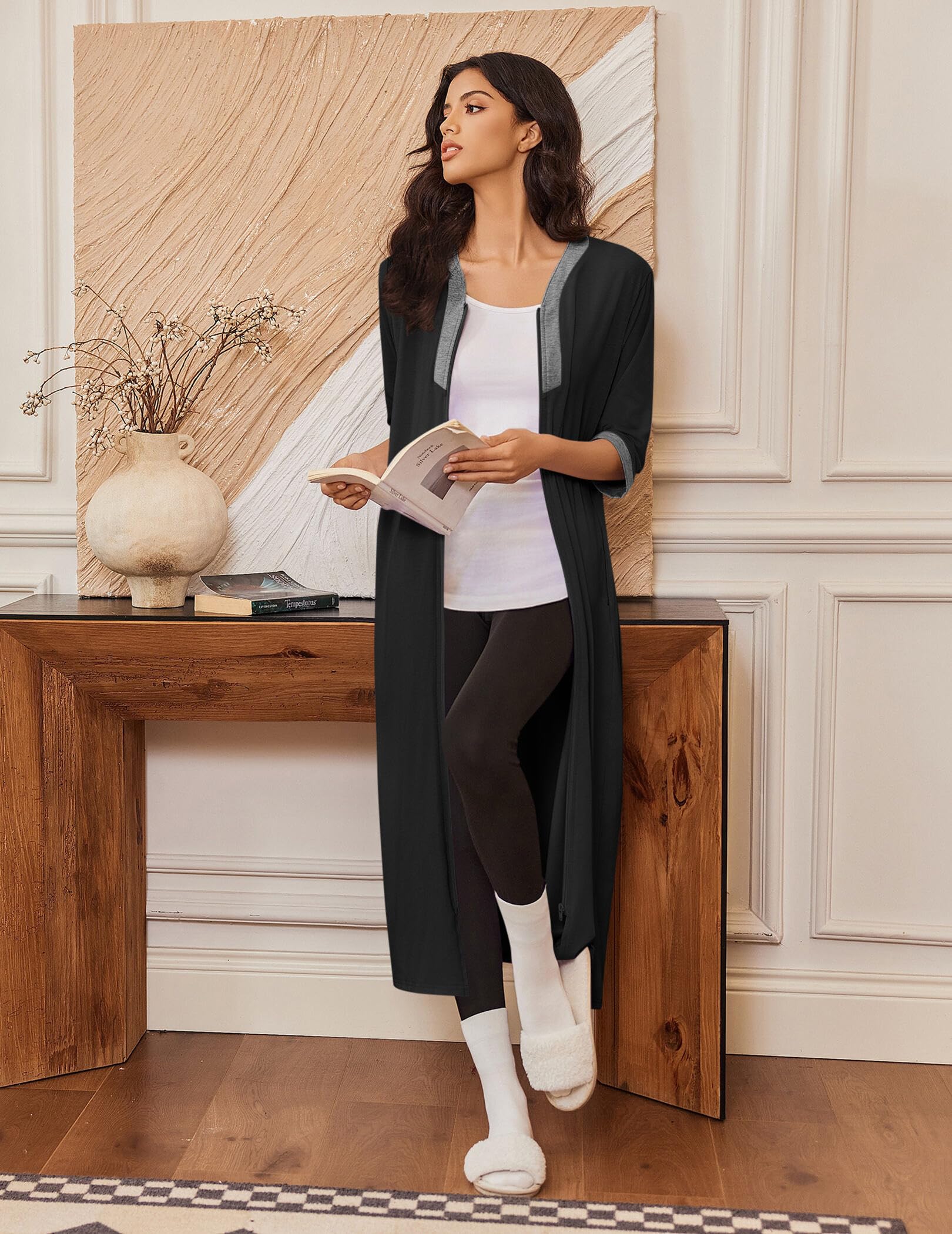 Ekouaer Women's Zipper Robe 3/4 Sleeves Housecoat Full Length Nightgown Soft Loungewear Robe with Pockets(Black, Medium)